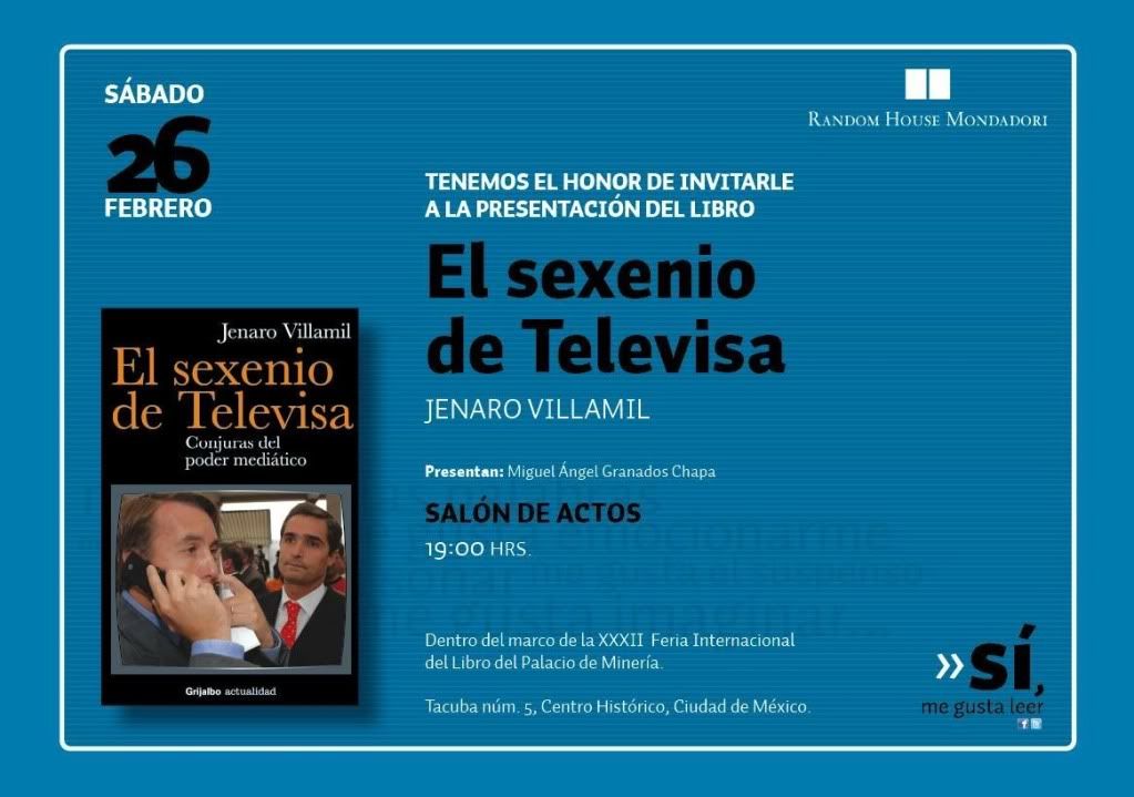 Resultado de una investigación de los últimos cinco años sobre el principal consorcio de medios y de opinión pública, el libro El Sexenio de Televisa, de Jenaro Villamil, y editado por Grijalbo, será presentado este sábado a las 19:00 horas en la Feria Internacional del Libro del Palacio de Minería, con la participación del columnista Miguel Angel Granados Chapa, autor de la columna Plaza Pública.